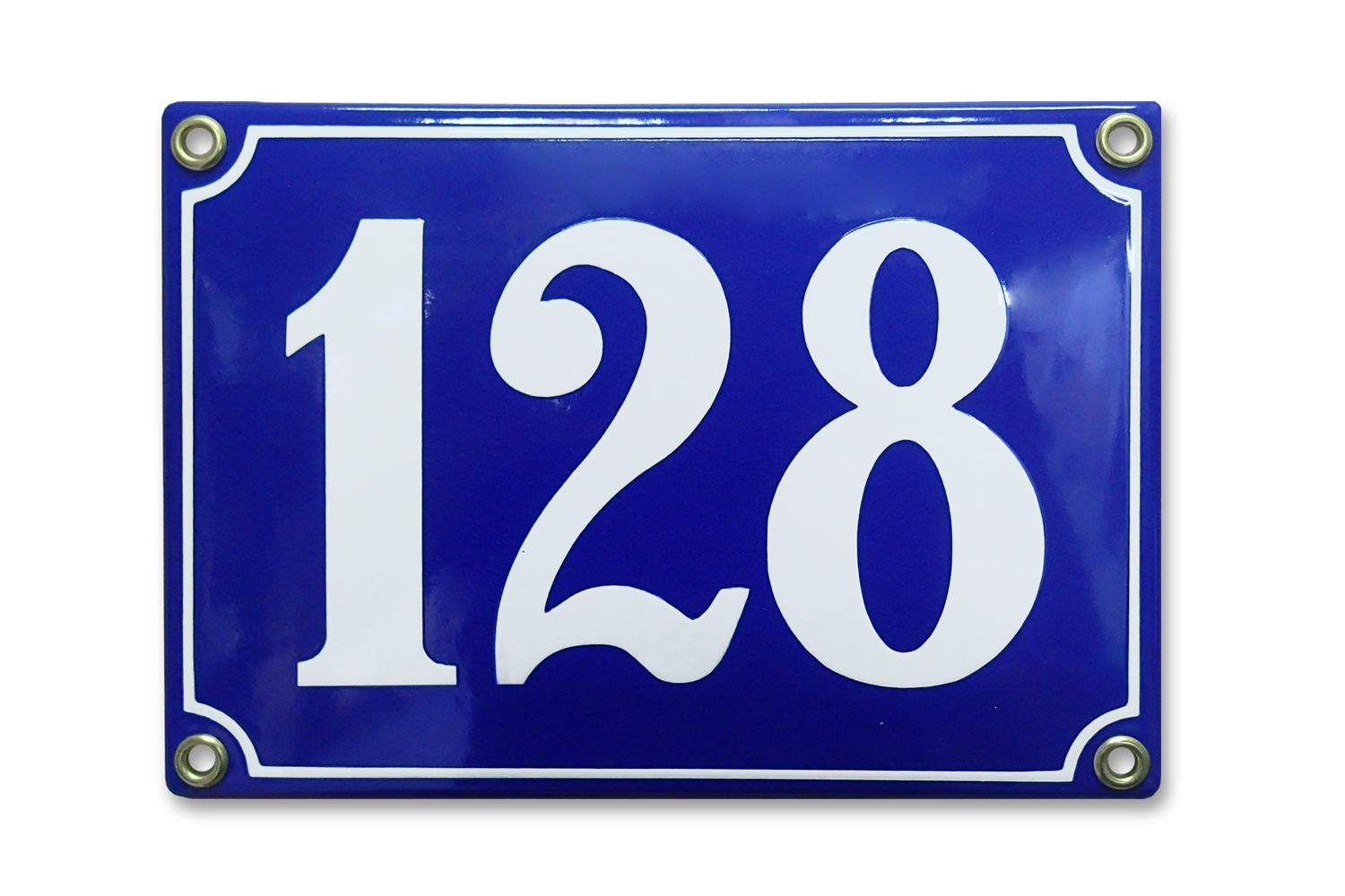 Tabliczka z numerem o wymiarach 12 x 12 cm, 12 x 14 cm, 12 x 17 cm z numerem, wykonana z blachy stalowej z 4 otworami do mocowania zabezpieczonymi mosiężnymi obrączkami.